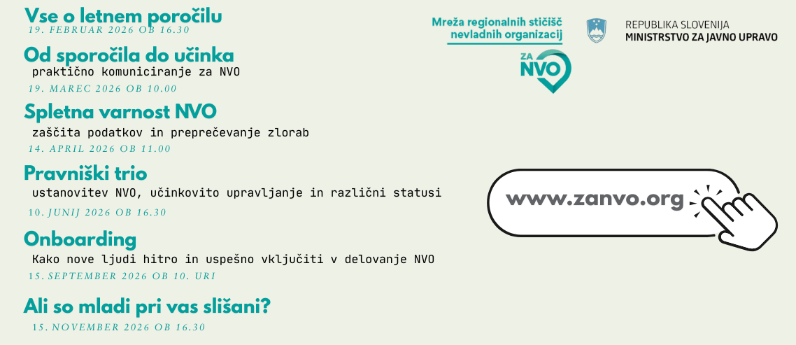 Objavljamo koledar brezplačnih spletnih usposabljanj, ki jih bomo v letu 2026 organizirala regijska stičišča nevladnih organizacij v okviru mreže zaNVO. Delavnice so namenjene vsem nevladnim organizacijam iz Slovenije. 19.2.2026 ob 16.30 Vse o letnem poročilu za leto 2025 PRIJAVA. 19.3.2026 ob 10.00 Od sporočila do učinka – praktično komuniciranje za NVO PRIJAVA. 14.4.2026 OB 11.00Beri dalje
