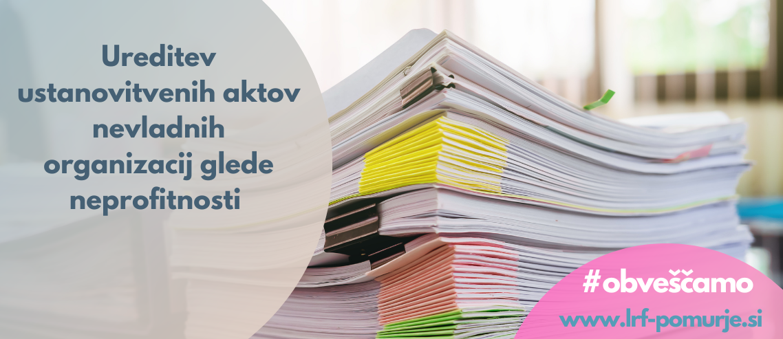 Ministrstvo za javno upravo nas je obvestilo, da moramo vse nevladne organizacije (društva, zavodi, ustanove), ki želijo sodelovati na javnih razpisih, imeti v svojih ustanovitvenih aktih jasno zapisano določilo o neprofitnosti in prenosu premoženja v skladu s 4. členom Zakona o nevladnih organizacijah (ZNOrg). To pomeni, da mora biti v vašem statutu ali drugem ustanovitvenem aktu zapisano: »V primeru prenehanja organizacije …