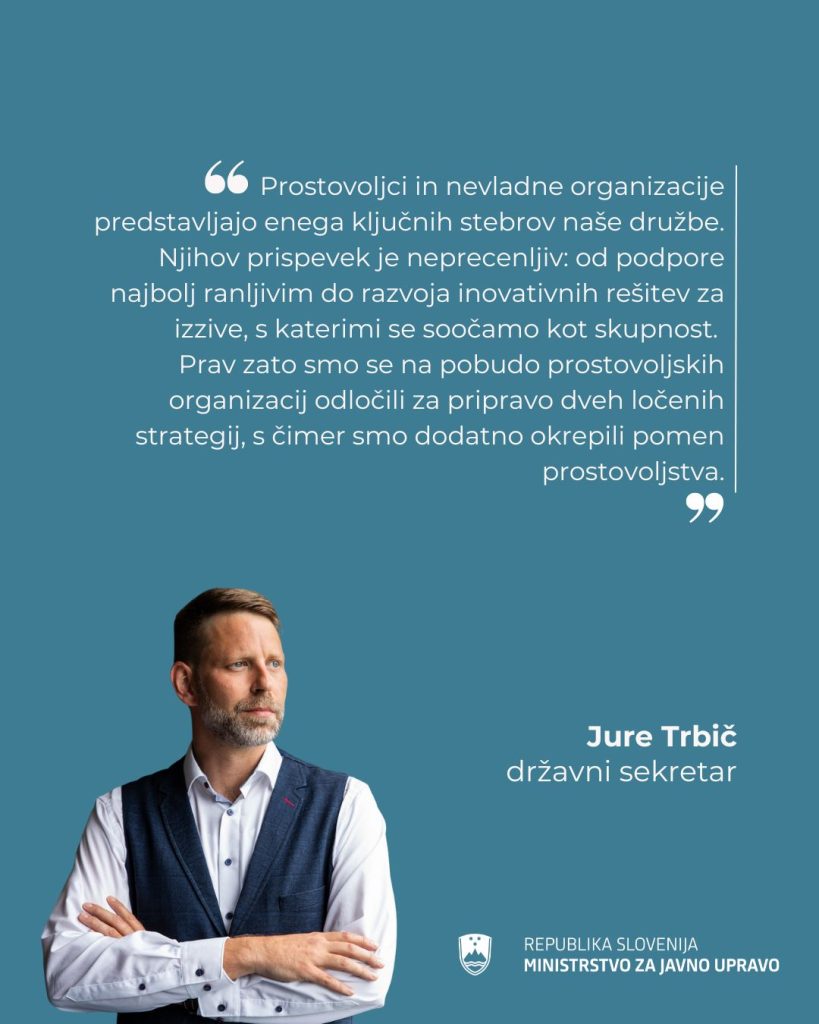 Prostovoljstvo predstavlja eno izmed osrednjih vrednot sodobne družbe, saj pomembno prispeva k utrjevanju socialne kohezije in solidarnosti, spodbuja aktivno državljanstvo ter podpira trajnostni razvoj skupnosti. V Republiki Sloveniji ima prostovoljstvo dolgoletno in bogato tradicijo ter že vrsto let pomembno vpliva na številna področja družbenega življenja. Tudi Strategija razvoja Slovenije 2030 prepoznava pomen prostovoljstva kot enega bistvenih elementov za dosego dostojnega življenja za vse. V tem okviru strategija izpostavlja dva osrednja vidika: prostovoljstvo kot samostojno in pomembno družbeno vrednoto ter vlogo prostovoljstva in prostovoljskih organizacij pri učinkovitem odzivanju na aktualne družbene izzive, kot so osamljenost, naraščajoče težave na področju duševnega zdravja, staranje prebivalstva, oboroženi konflikti, podnebne spremembe ter naravne nesreče. Strategija vsebinsko predstavlja nadaljevanje Strategije o razvoju nevladnih organizacij in prostovoljstva do leta 2023, v delu.